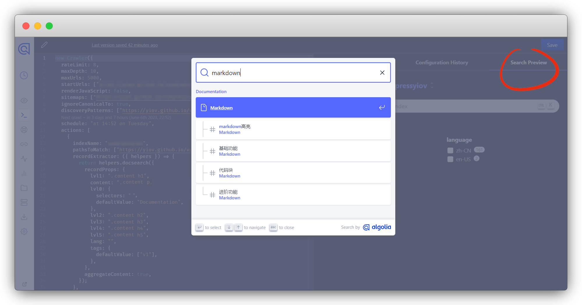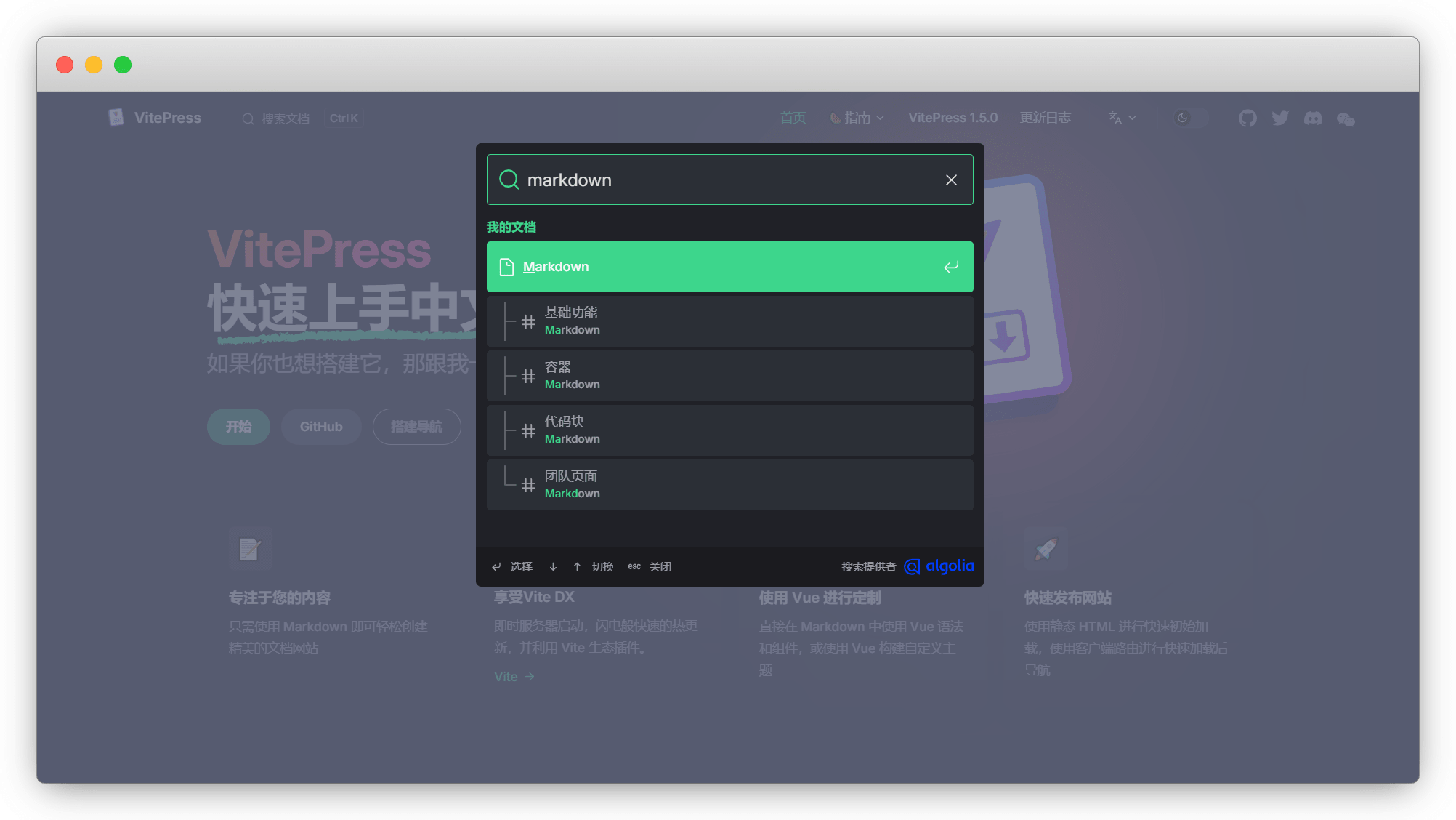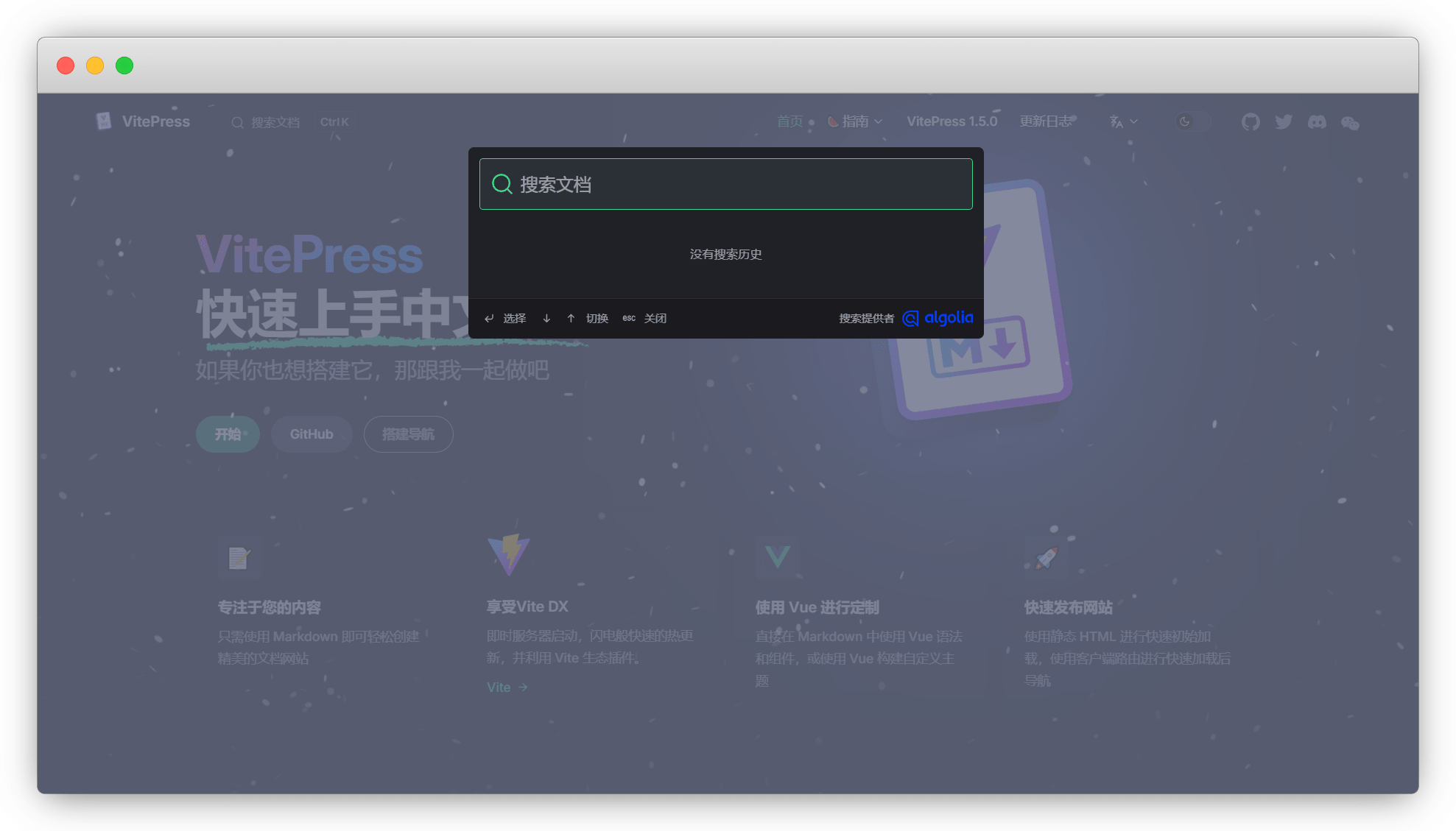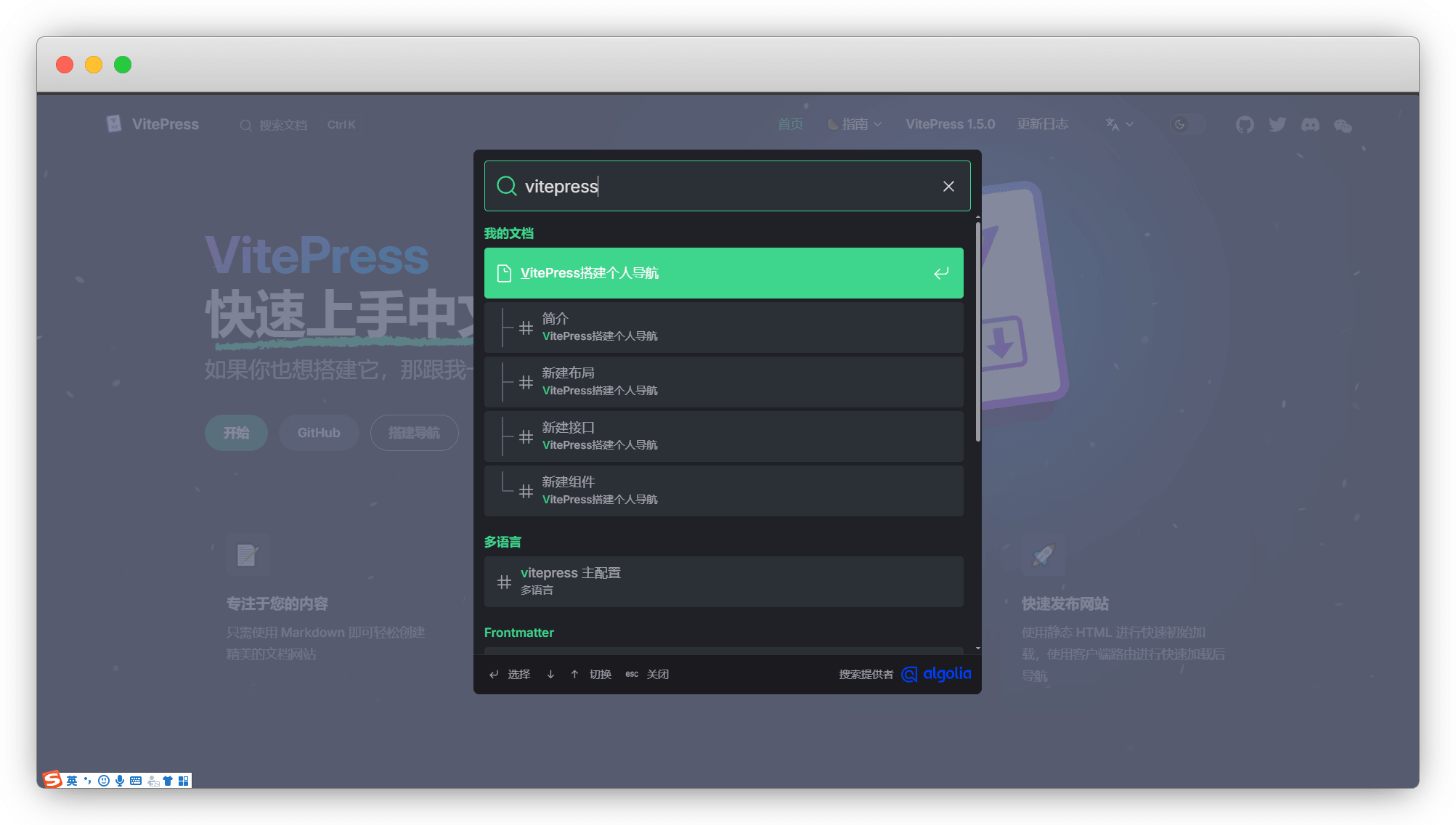 其实也有很多热门的爬虫搜索引擎,而Algolia的 Algolia DocSearch 是直接集成在VitePress中的,我们来看看有多么强大吧