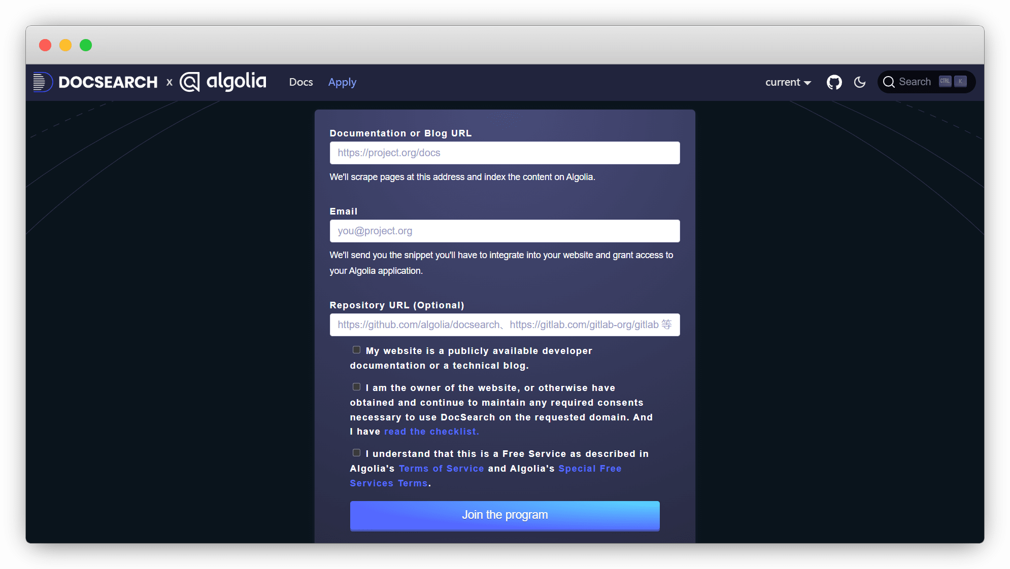 官方申请申请时需要提交链接、邮箱及仓库(可选) ,等待周期较长,通过后会自动爬取,直接配置使用即可