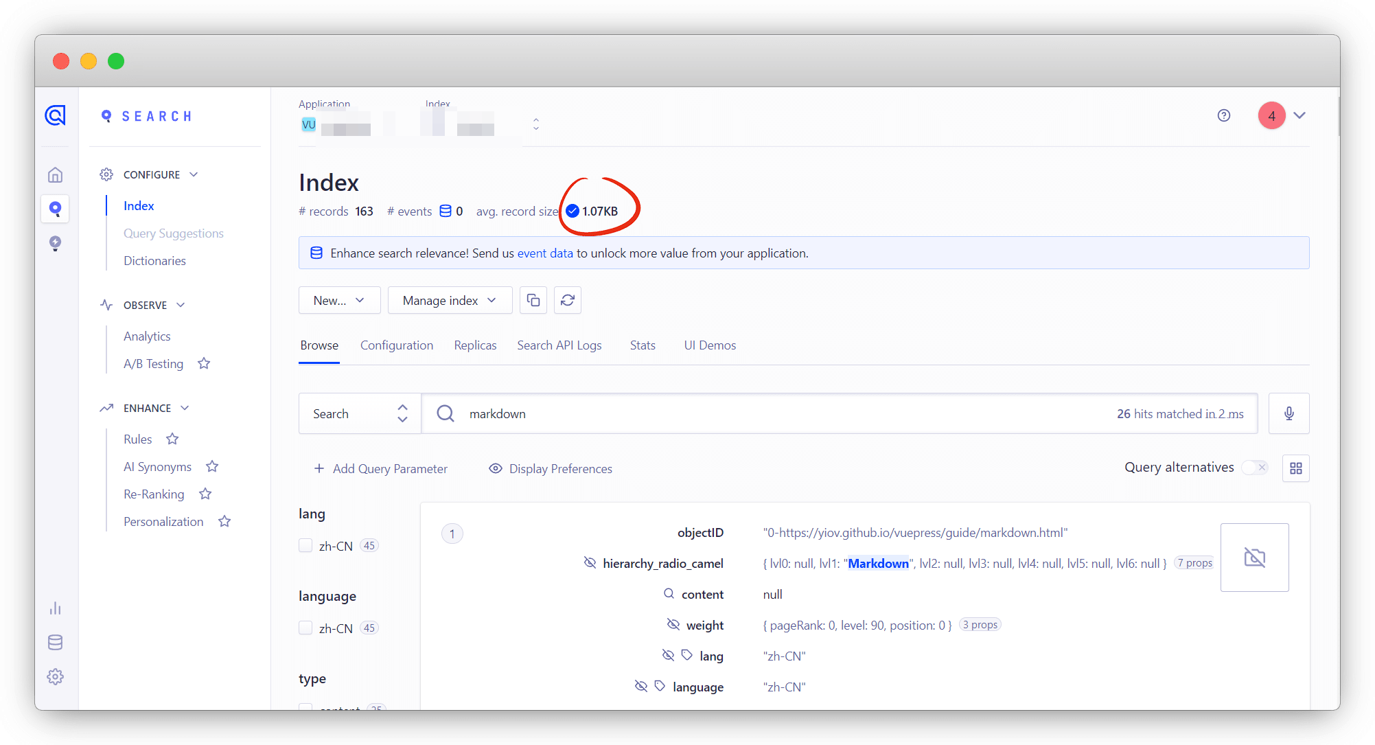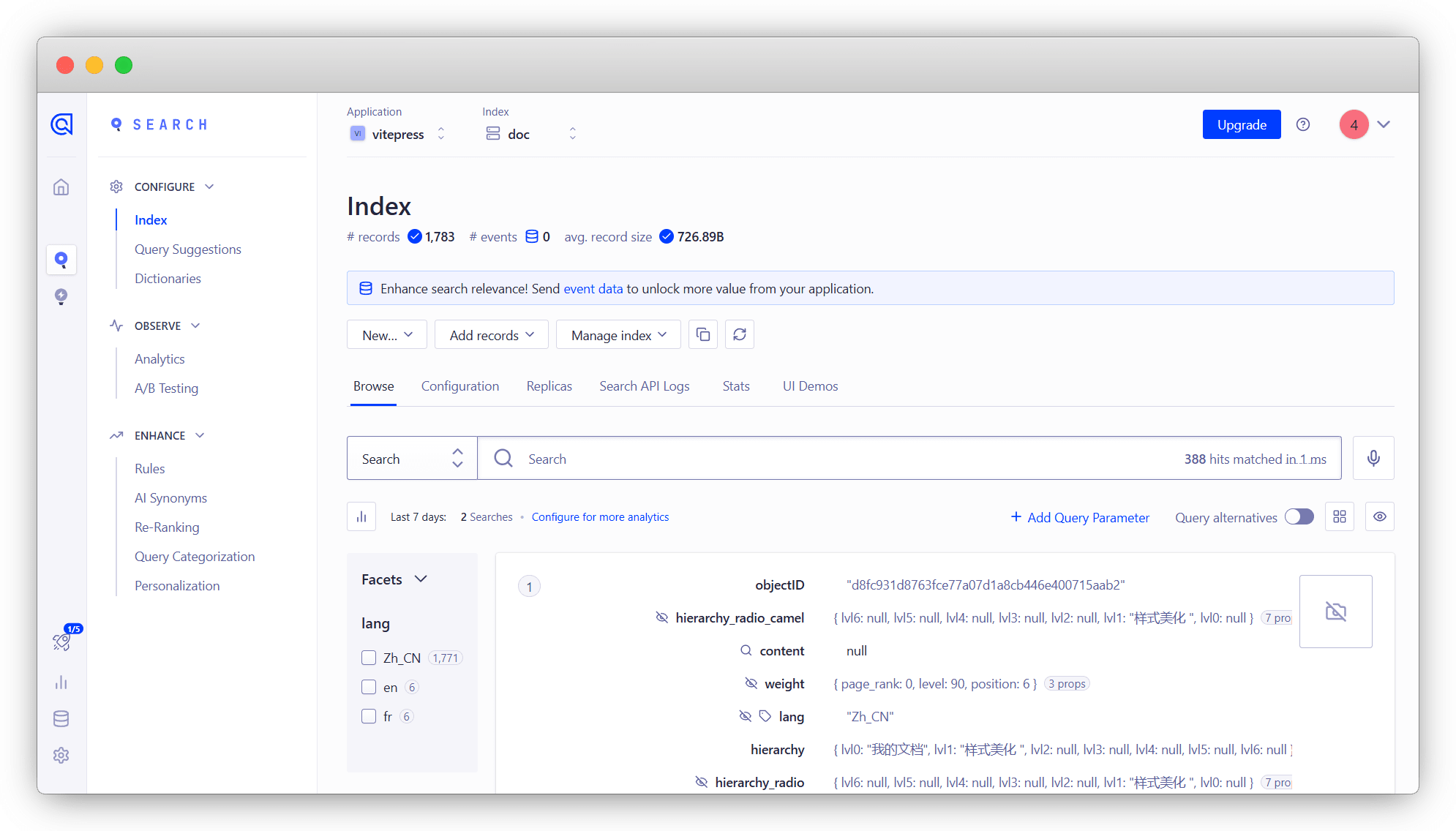 • attributesForFaceting:必须具备 lang tags 否则有数据也用不了