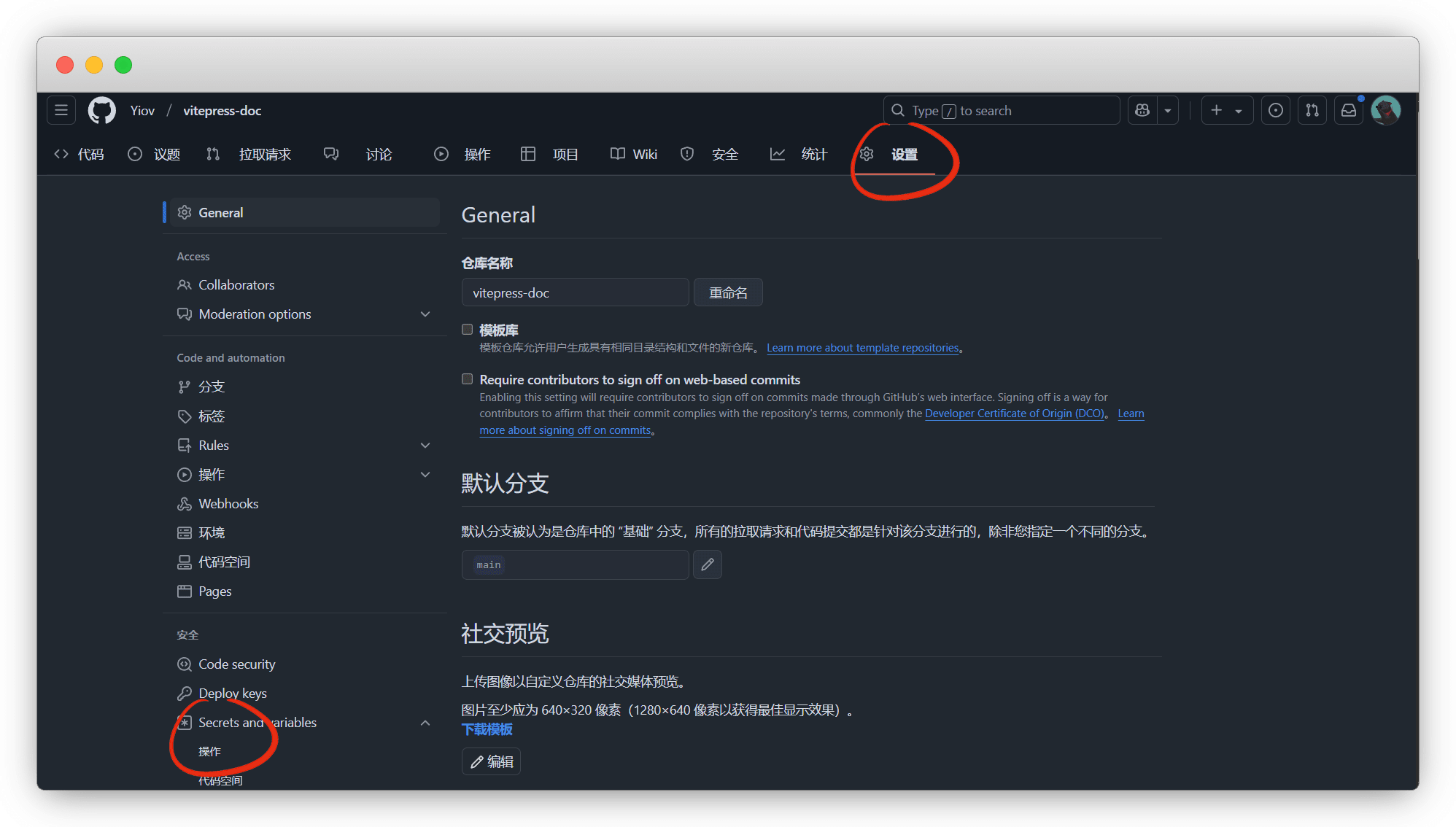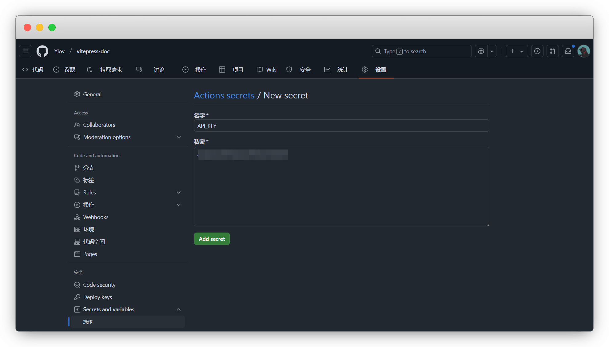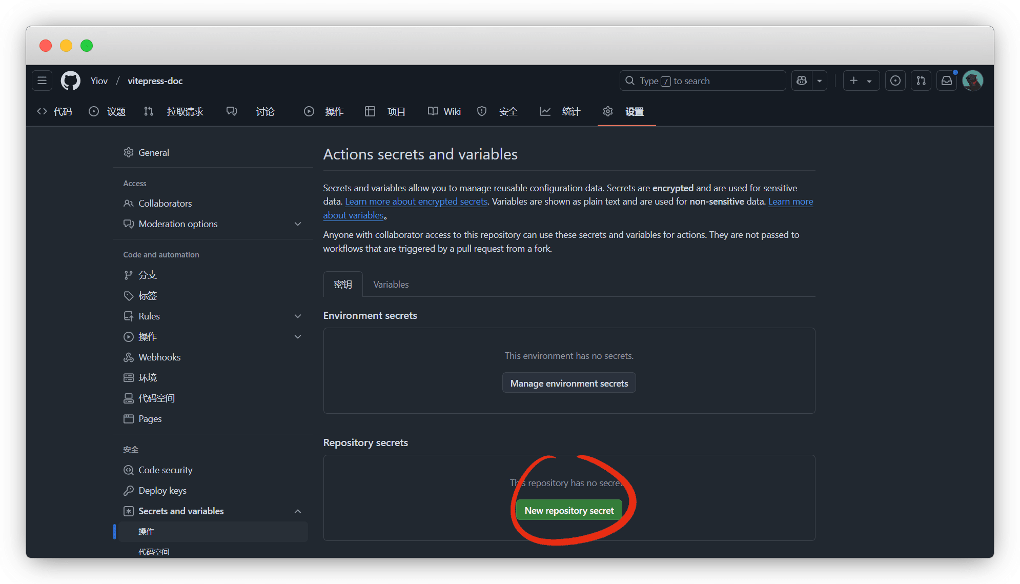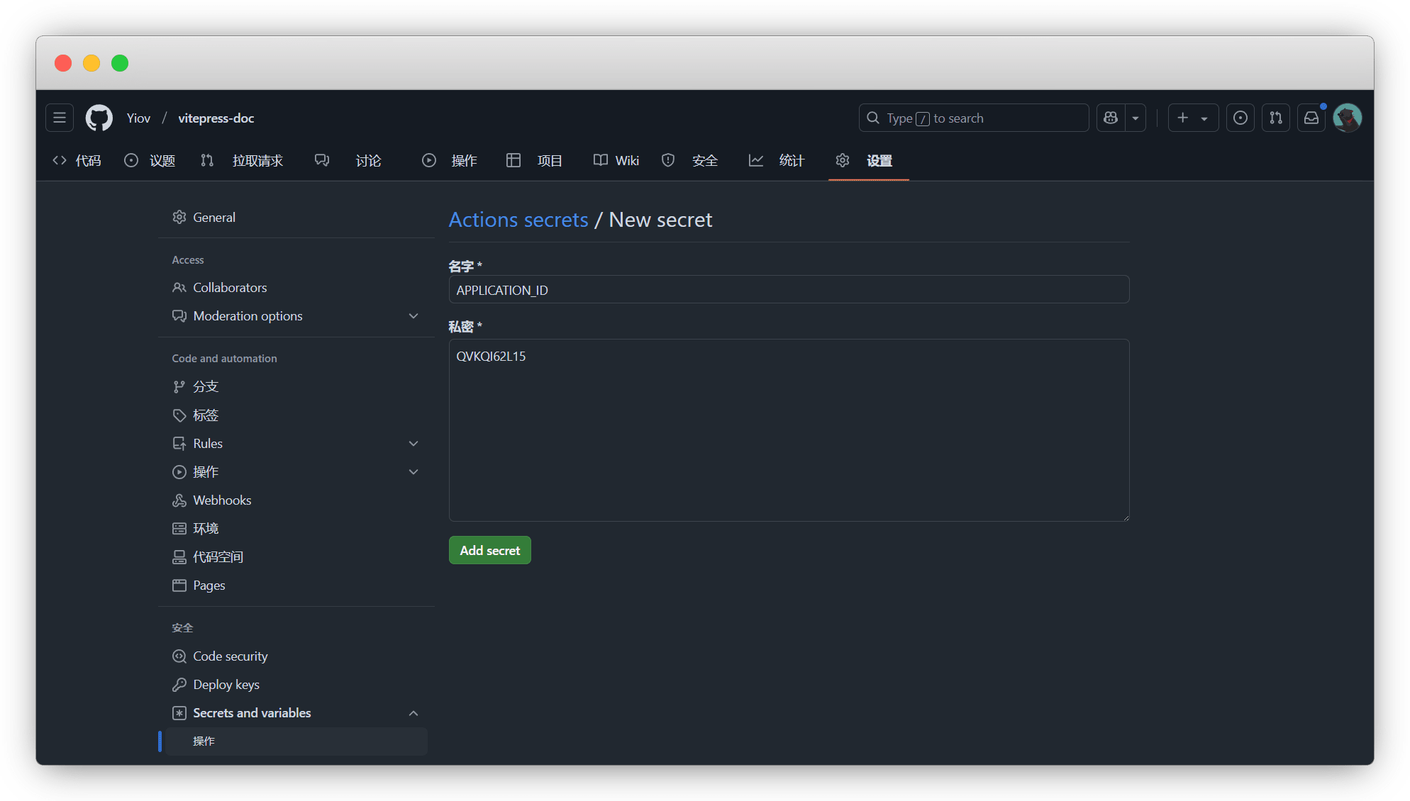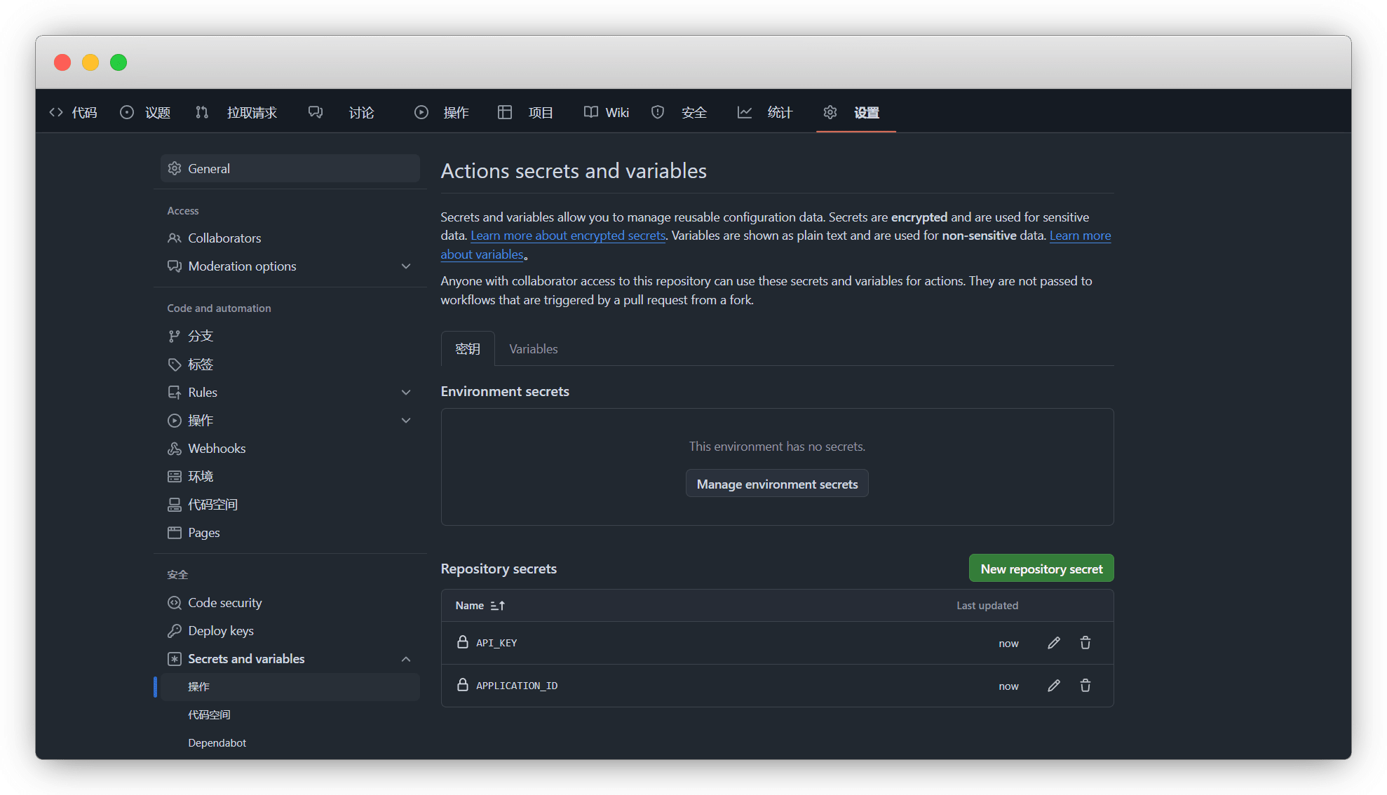 我们在任意仓库(公开或私密) - 设置 - Secrets and variables - actions