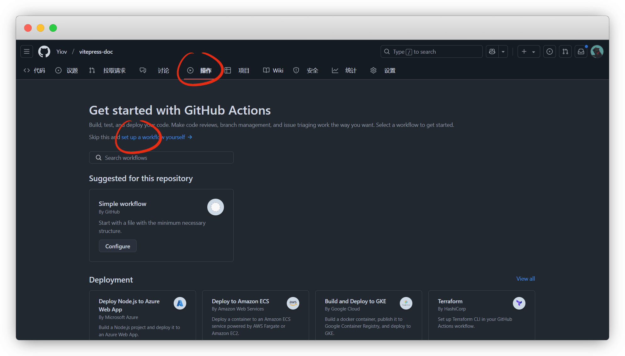 然后在仓库,点击 Actions - set up a workflow yourself 新建一个工作流