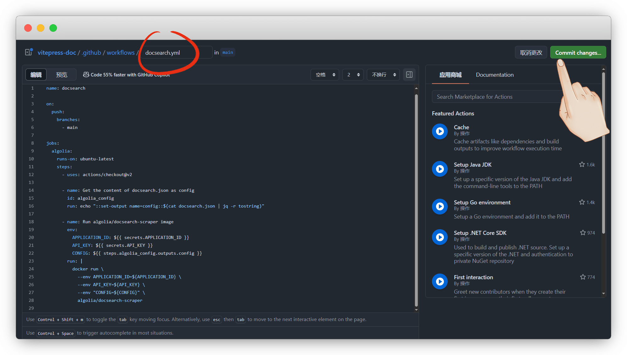 命名为 docsearch.yml ,复制粘贴下面的工作流代码,提交